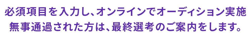 メニュー オーディション概要 運営会社について 所属クリエイター 合格特典 応募資格について オーディションの流れ よくあるご質問 今すぐ無料エントリー 無料エントリー 今すぐ無料エントリー ※所属クリエイターの一部をご紹介 今すぐ無料エントリー Ⓠ.SNS投稿の経験がなくても大丈夫? はい!問題ありません。未経験者でもチャンスは平等に御座いますので、安心してご参加ください。 Ⓠ.地方在住ですが、応募は可能ですか? 日本全国どこでも応募を受け付けております。オンラインで審査を行いますので、まずは気軽にエントリーして下さい! Ⓠ. 書類・動画審査って具体的にどんな事? 簡単なあなたの情報と、10~30秒程度の動画を送るだけ!動画撮影内容は「SNSを通じてどのように活躍したいか」・「私のこの特技を見てほしい」など。あなたの熱い気持ちを是非表現してください!スタッフが丁寧に一人一人を審査致します。 Ⓠ. 費用はかかりますか? オーディション参加において費用は発生しませんので、お気軽にご応募ください。プログラムへの参加が決定した場合、一定の費用(マネジメント費用等)をご負担いただきます。 審査過程の交通費・諸費は個人負担となります 未成年の方は保護者の同意の上、ご応募下さい 必ず候補者の同意を得てご応募ください LINEで連絡が取れない場合は、選考ストップ オーディション時は録音・撮影は禁止です 事務所への直接訪問は一切お断りしております 審査合格者からは当社規定のマネジメント費をいただく場合がございます。 エントリー前の疑問点・相談など 気になる点はお気軽にお問合せ下さい お問い合わせはコチラ ご入力いただいた情報に個人情報が含まれる場合には、当該情報は、当社プライバシーポリシー(URL)に則って管理させていただきます。情報をご入力いただく前に、当社プライバシーポリシーをご確認いただくようお願いいたします。 プライバシーポリシー 志望ジャンル必須 インフルエンサーYoutuberモデルアーティストアイドル俳優タレントその他 名前(姓)必須 名前(名)必須 性別必須 選択してください男性女性その他 都道府県必須 選択してください北海道青森県岩手県宮城県秋田県山形県福島県茨城県栃木県群馬県埼玉県千葉県東京都神奈川県新潟県富山県石川県福井県山梨県長野県岐阜県静岡県愛知県三重県滋賀県京都府大阪府兵庫県奈良県和歌山県鳥取県島根県岡山県広島県山口県徳島県香川県愛媛県高知県福岡県佐賀県長崎県熊本県大分県宮崎県鹿児島県沖縄県海外 電話番号必須 自由記入任意 このサイトは reCAPTCHA と Google によって保護されています プライバシーポリシーと利用規約が適用されます。 プライバシーポリシー| 重要事項に関する表示 © BitStar-Audition運営事務局